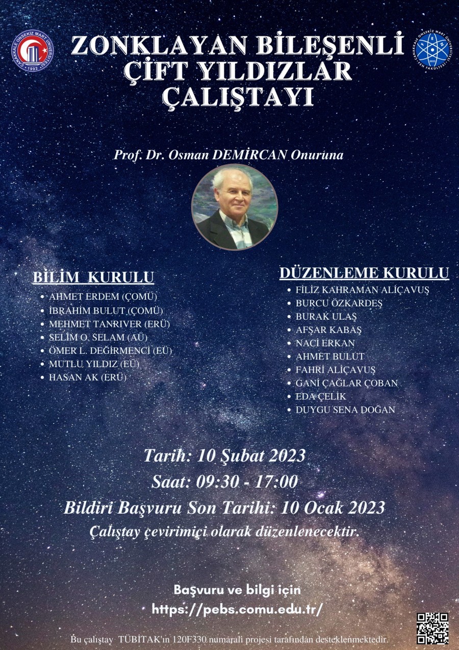 Üniversitemiz ve Fizik bölümümüzün kıymetli hocalarından Sayın Prof.Dr. Osman DEMİRCAN hocamızın onuruna “Zonklayan Bileşenli Çift Yıldızlar” başlıklı bir çalıştay düzenlenecektir. Çalıştay 27 Şubat 2023 tarihinde çevirimiçi olarak gerçekleştirilecektir. Çalıştayda davetli hocalarımızın konuşmalarına yer verilecek ve ayrıca bildiri kabulleri de yapılacaktır. Çalıştayla ilgili detaylı bilgilere https://pebs.comu.edu.tr/ web sayfasından ulaşabilirsiniz.
