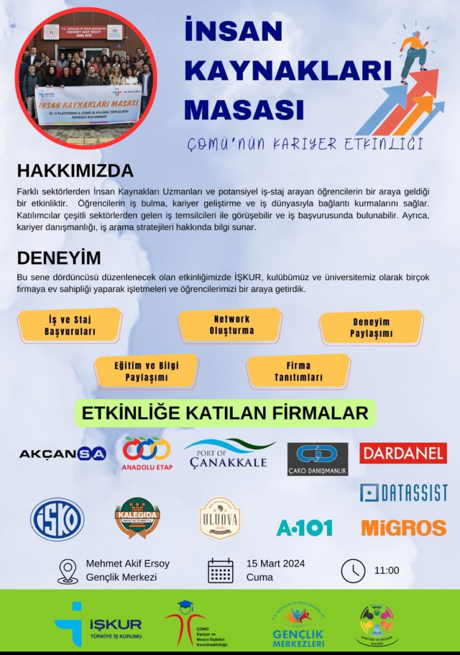 Farklı sektörlerden İnsan Kaynakları Uzmanları ve potansiyel iş-staj arayan öğrencilerin bir araya geldiği bir etkinlik olan ve öğrencilerin iş bulma, kariyer geliştirme ve iş dünyasıyla bağlantı kurmalarını sağlaması amacıyla COMU Kariyer günleri etkinliği 15 Mart 2024 Cuma günü düzenlenecektir. Öğrencilerimizin katılım sağlaması beklenmektedir. İlgili öğrencilerin dilerlerse özgeçmişlerinide yanlarında getirmeleri tavsiye edilmektedir.